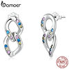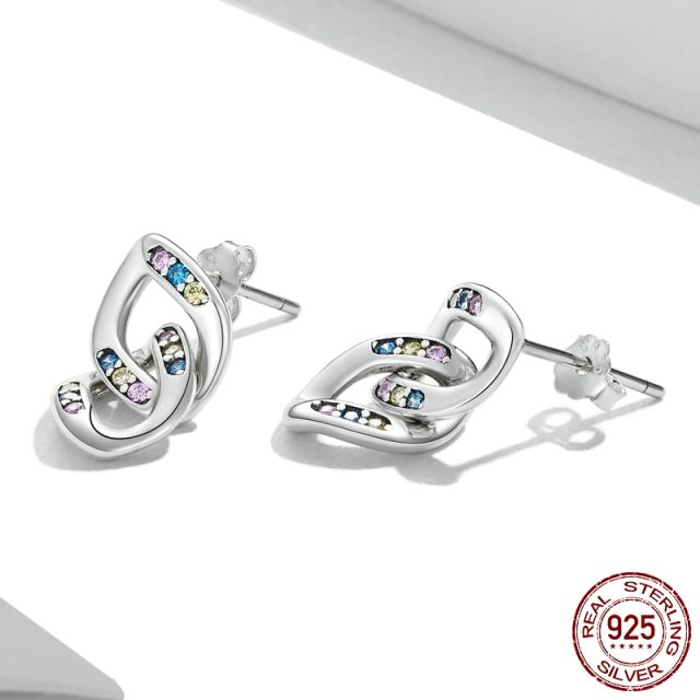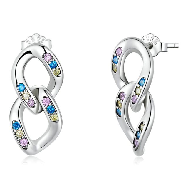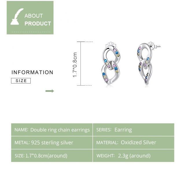 The oxidized silver double-ring chain stud earrings are unique, delicate, and shiny; embellished with colorful zircons, they are fashionable and versatile.