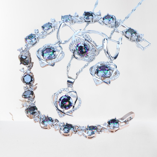 Rainbow Cubic Zirconia Jewelry Sets  Give your loved one a sparkling new jewelry set this year! This silver 925 cubic zirconia jewelry set includes a ring, earrings, and necklace. The necklace features a delicate chain with a pendant. The ring is made of sterling silver and has a rainbow cubic zirconia stone. The earrings are made of solid silver and feature a rainbow cubic zirconia stone. This jewelry set is perfect for your loved one this holiday season!