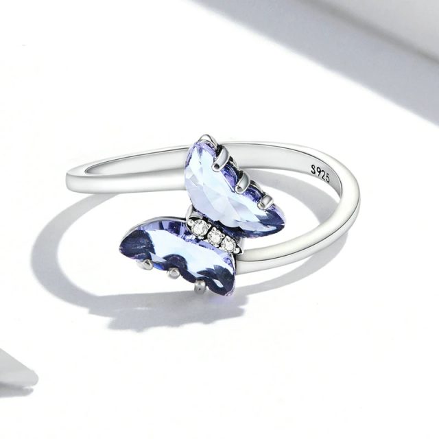 This sterling silver butterfly ring is a delicate design that features a silver butterfly in flight. The butterfly has large wings and delicate antennae that extend from the sides of the ring. The wings are delicately detailed with intricate patterns and colors that make the ring truly unique. This sterling silver butterfly ring is a great gift for any woman who loves butterflies.